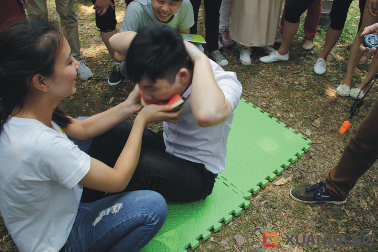 “請(qǐng)大家排好隊(duì)伍,圍成一個(gè)圈……”個(gè)人游戲“一元五角”在主持人的帶動(dòng)下開(kāi)始了。游戲分兩輪,每組每輪派 4 人參加( 2 男 2 女),男生代表一元,女生代表五角。游戲開(kāi)始放音樂(lè),大家圍成一個(gè)全圈往前走。音樂(lè)停止,主持人報(bào)一個(gè)金額。所有人要在最短時(shí)間內(nèi)組隊(duì),湊足金額,落單的人淘汰,比賽結(jié)果記入個(gè)人的成績(jī)中。這場(chǎng)游戲讓大家精神高度緊張,笑聲此起彼伏。